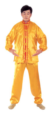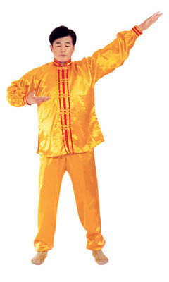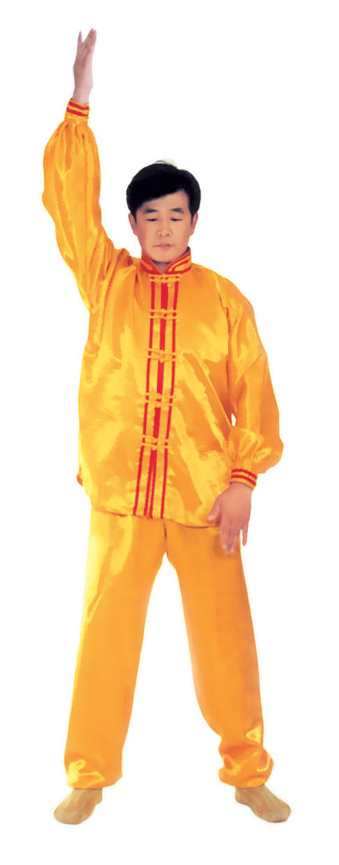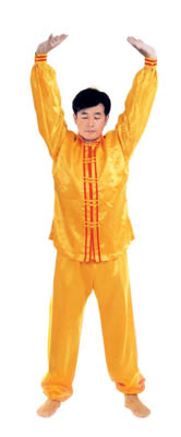 Chưởng chỉ càn khôn[5]: Bắt đầu từ thế “hợp thập”. Hai bàn tay tách ra, cách nhau chừng 2~3cm, đồng thời bắt đầu xoay bàn tay, nam tay trái (nữ tay phải) xoay hướng vào ngực, tay phải hướng ra ngoài ngực, hình thành tay trái ở trên, tay phải ở dưới và cẳng tay giống hình chữ “nhất” (nữ thì trái phải ngược lại), (như hình 1.6) Tiếp theo, cẳng tay trái duỗi thẳng chếch lên bên trái, bàn tay úp xuống, độ cao bàn tay ngang với đầu thì dừng; tay phải đặt chỗ trước ngực, bàn tay ngửa lên. Thuận theo khi tay trái dần dần tới vị trí, thì toàn thân cũng dần dần căng thẳng, đầu dựng lên, chân dẫm xuống. Tay trái duỗi thẳng phía chếch bên trái, tay phải ở trước ngực, bắp tay thẳng hướng phía ngoài (như hình 1.7). Duỗi khoảng 2~3 giây đồng hồ, rồi toàn thân lập tức buông chùng, tay trái lại thu về chỗ trước ngực và cùng với tay phải thành trạng thái “hợp thập”. Sau đó lại xoay bàn tay, triển khai tay phải (nữ tay trái) ở trên, tay trái ở dưới (như hình 1.8). Tay phải lặp lại động tác vừa rồi của tay trái, tức là cẳng tay duỗi chếch sang bên phải, bàn tay úp xuống, bàn tay có độ cao ngang đầu; tay trái vẫn ở chỗ trước ngực, bàn tay ngửa lên. Sau khi duỗi căng xong (như hình 1.9) toàn thân lập tức buông chùng. Thu tay về sau đó hai tay “hợp thập” trước ngực (như hình 1.5)